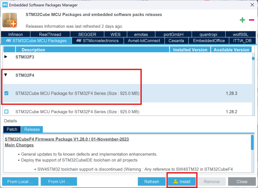 找到所需系列芯片,例如:STM32F4,选择最新版本,点击 Install 安装。