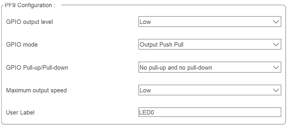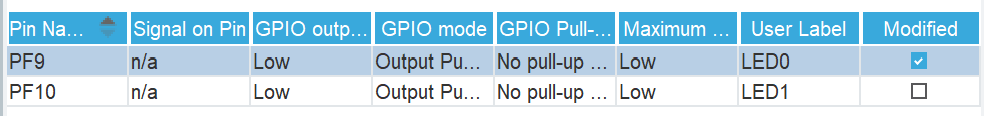 PF9 和 PF10 设置为推挽输出低电平,写上标签 LED0 和 LED1。