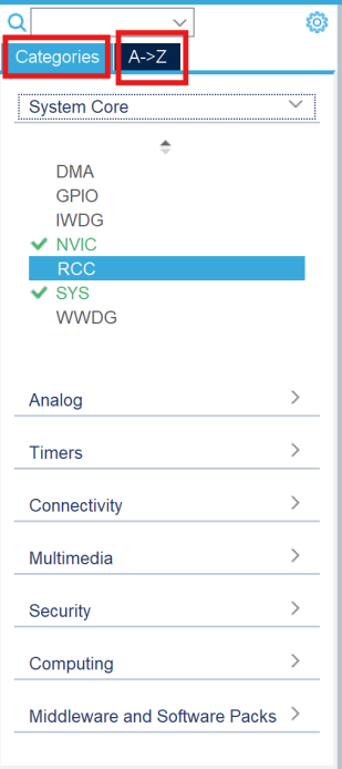 - 组件列表:MCU 可以配置的系统内核,外设和中间件列表,可分组显示或者按照字母顺序显示。