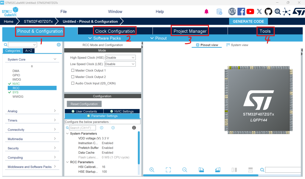 - 引脚与配置:对 MCU 的系统内核,外设,中间件和引脚进行配置。