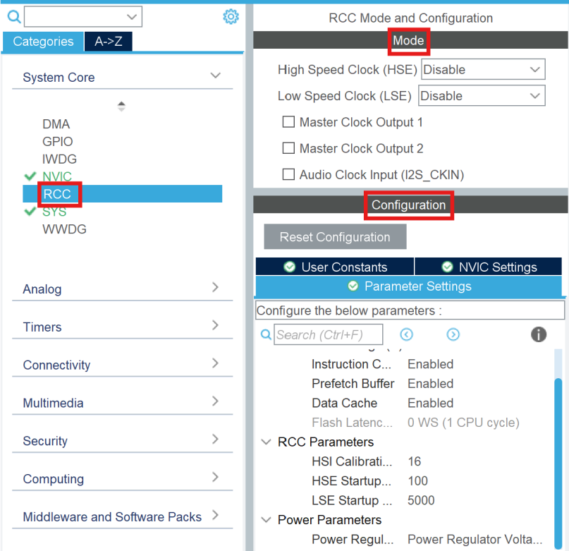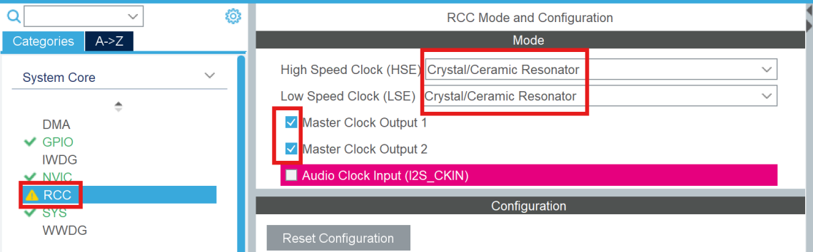 先设置 RCC 的模式,将 HSE 和 LSE 都设置为使用外部晶振,并且启用 MCO1 和 MCO2,MCO2 与音频时钟输入不能同时使用。