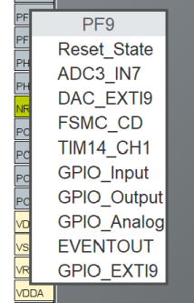在引脚上单击鼠标左键,弹出引脚功能选择菜单,例如引脚在 PF9 上单击时,可以看到 PF9 可以作为 GPIO,ADC,定时器等使用: