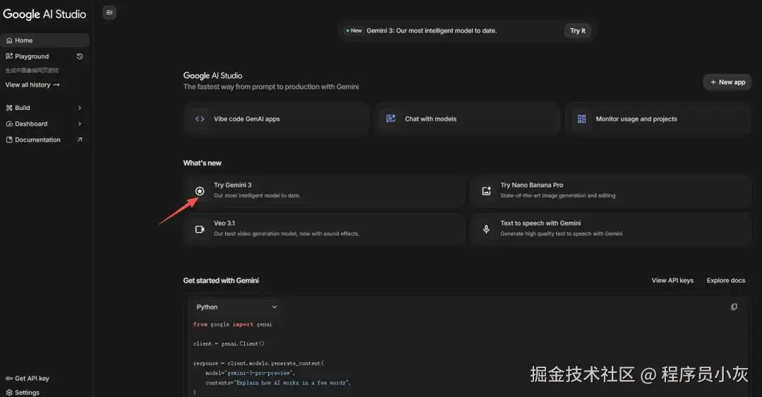 在网站首页点击"Try Gemini3"选项,同样可以免费使用Gemini3。Google AI Studio也存在一定的使用频次限制,但是比官网要宽松一些,大约每天可用50次左右。