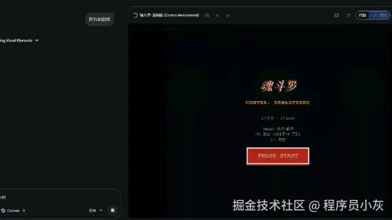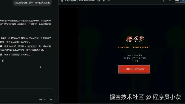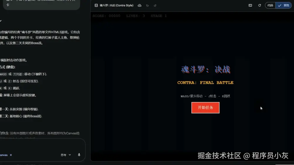 好了,用Gemini3开发魂斗罗小游戏的过程,我们就展示到这里。没有复杂的提示词,没有美工资源,仅仅是几轮简单的对话,Gemini3就为我们生成了这样一款完成度较高的游戏,这样的代码能力不可谓不惊艳。