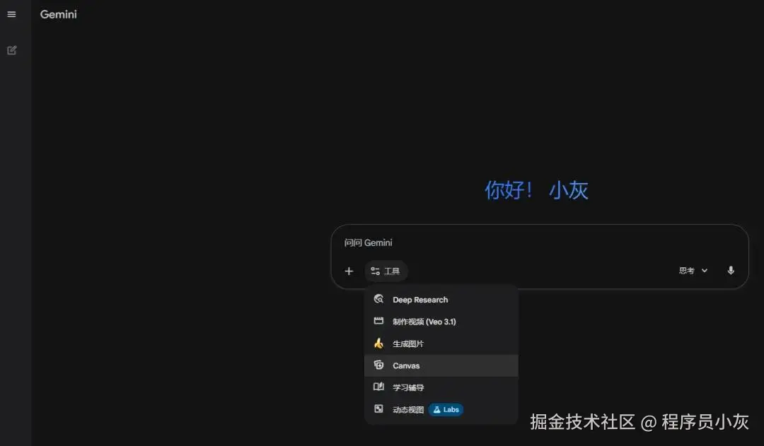 首先把Gemini的工具选项当中找到Canvas,这是Gemini的核心功能之一,专门用于处理长篇写作和编程任务:
