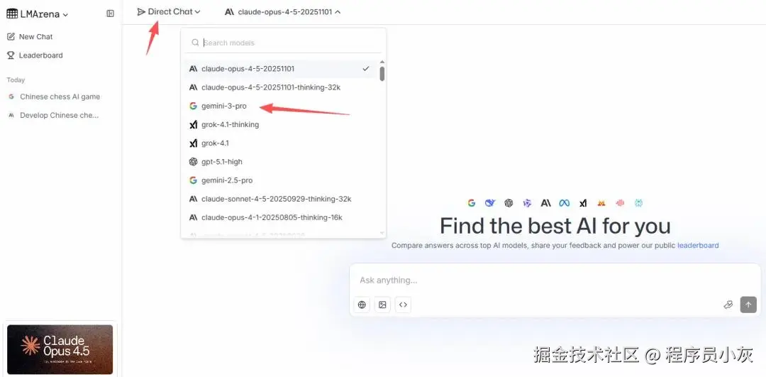 把LMArena首页的模式设置为"Direct Chat"(直接聊天),大模型选择gemini-3-pro,即可开启免费的使用。