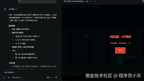 从视频中可以看到,Gemini3很快就为我们生成了一套Html5游戏代码,接下来让我们进行第一次测试:
