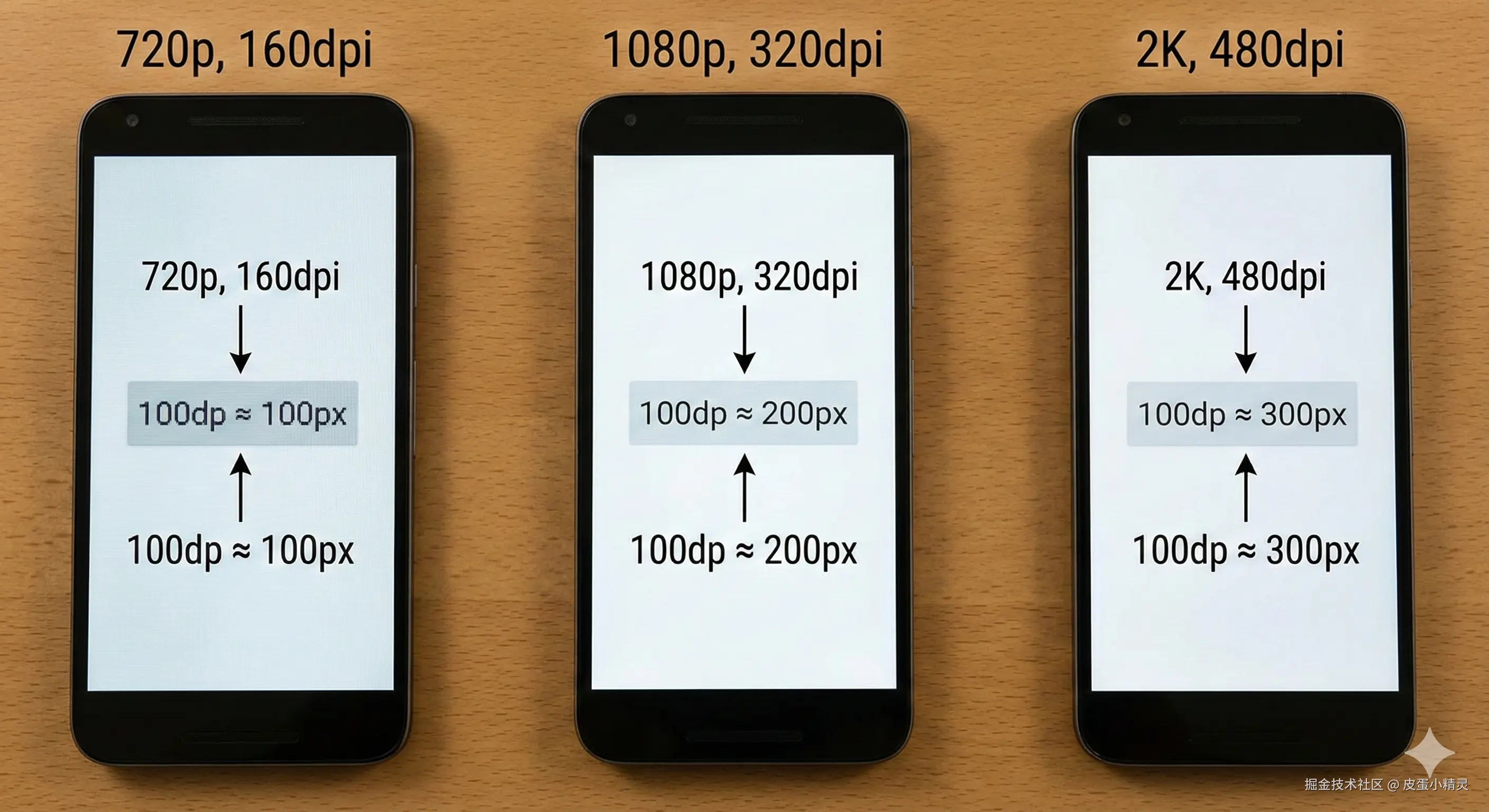 现在,160/320/480dpi 和 dp→px 的关系就理清楚了,也解释了"为什么同样的 dp 在不同手机上看起来差不多大"。