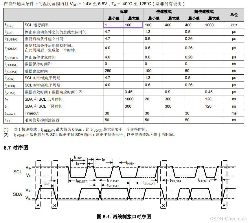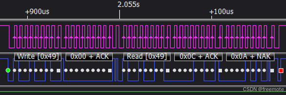 可以看出TMP118对时序要求不高,在I2C标准模式下,支持1KHZ到100KHZ的速率。因此本文使用软件模拟I2C,抓取时序如下: