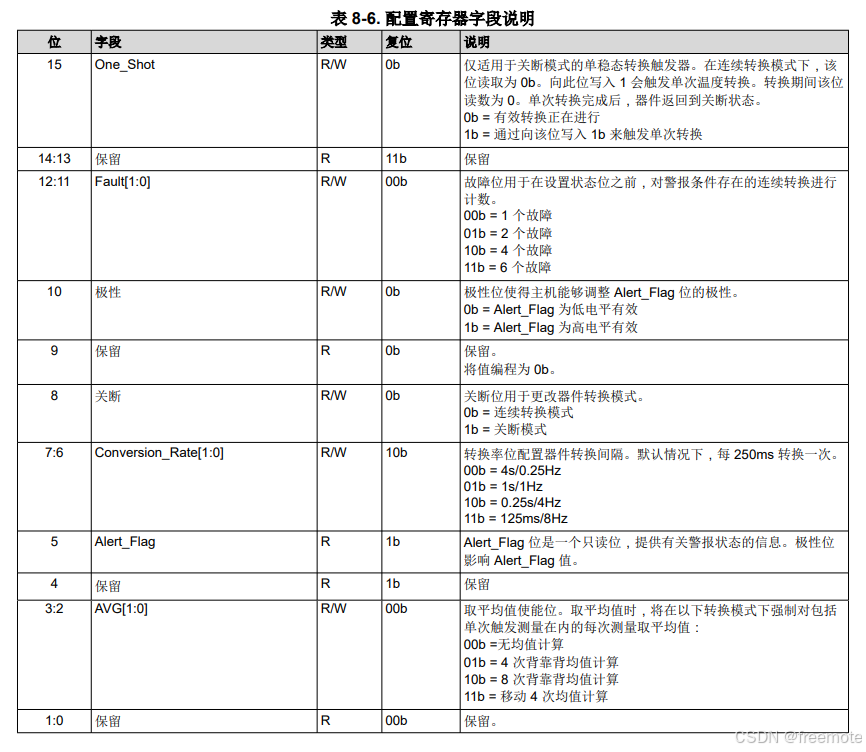 寄存器也很简洁,只有8个寄存器,主要需要关注温度寄存器(0h)、配置寄存器(1h)、器件ID寄存器(Bh)。