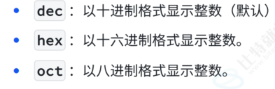 这些操纵符是 "全局生效" 的 ------ 一旦设置,后续所有整数输出都会沿用该进制,直到重新修改(如再次用dec切回十进制)。