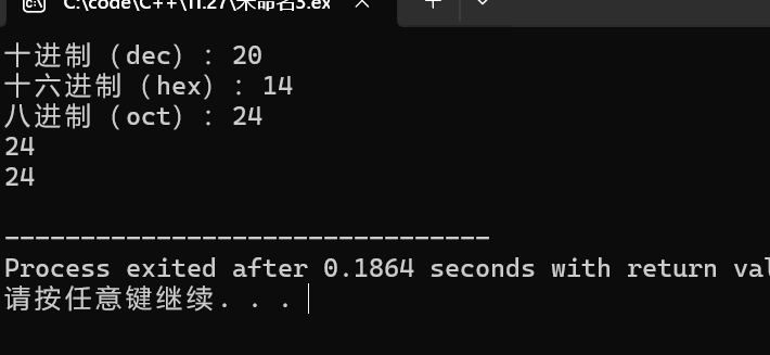 cout << "十进制(dec):" << dec << num << endl; // 默认,输出20