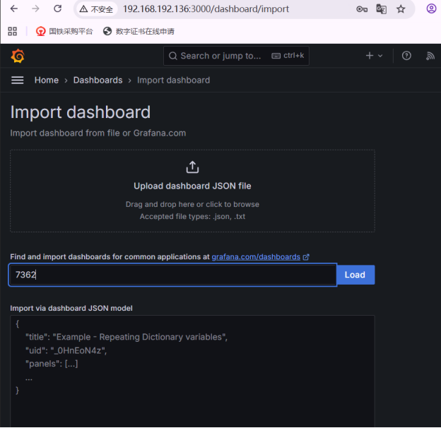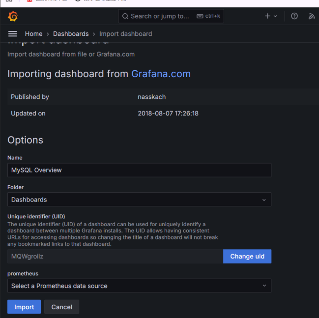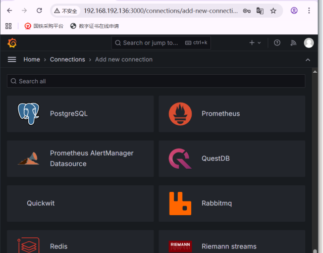 启动 [root@monitor ~]# systemctl start grafana-server [root@monitor ~]# systemctl status grafana-server [root@monitor ~]# systemctl enable grafana-server 5.4.3 关联Promethues并设置仪表盘模版 # 浏览器其中输入:http://192.168.88.163:3000 # 初始账户/密码:admin/admin # 设置新的密码:123456 # 在设置界面中选择Home > Connections > Data sources > prometheus # 设置prometheus监听地址:http://192.168.88.163:9090 # save&test # 选择监控模版来显示mysql的关键指标,模版ID为7362 按要求配置监控平台组件 :
