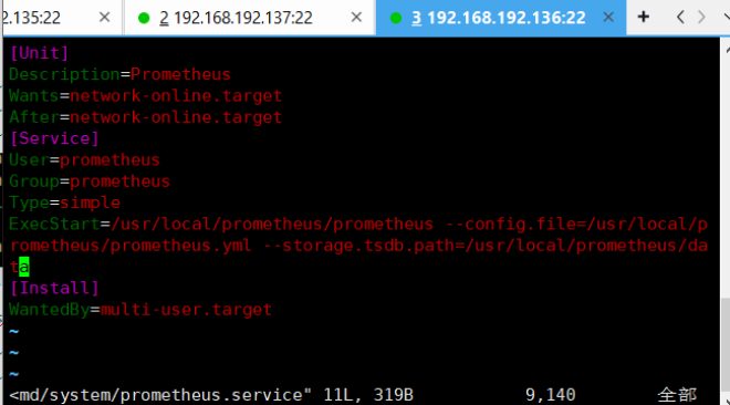 新建prometheus账户 [root@monitor ~]# useradd --no-create-home --shell /bin/false prometheus [root@monitor ~]# chown -R prometheus:prometheus /usr/local/prometheus 5.3.2配置prometheus系统服务 Vim /usr/lib/systemd/system/prometheus.service