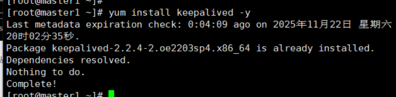 至此master1(从)--master2(主)构建完毕 4.4 安装keepalived并配置 4.4.1 2台MySql服务器安装keepalived软件包 安装安装包