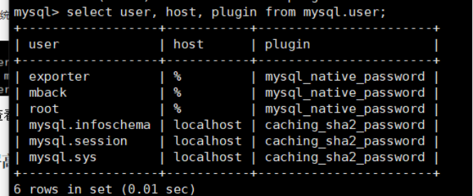 2台mysql节点创建用户并授权 # master1操作 [root@master1 ~]# mysql -uroot -p Enter password: mysql> create user 'exporter'@'%' identified with mysql_native_password by '123456'; Query OK, 0 rows affected (0.01 sec) mysql> grant process, replication client, select on *.* to 'exporter'@'%'; Query OK, 0 rows affected (0.00 sec) mysql> flush privileges; Query OK, 0 rows affected (0.01 sec) mysql> exit # master2操作,由于设置了主-主集群架构,master1创建账户后会同步到master2,只需查看即可 [root@master2 ~]# mysql -uroot -p Enter password: mysql> select user ,host from mysql.user; +------------------+-----------+ | user | host | +------------------+-----------+ | exporter | % | # 已经同步 | mback | % | | mysql.infoschema | localhost | | mysql.session | localhost | | mysql.sys | localhost | | root | localhost | +------------------+-----------+ 6 rows in set (0.00 sec) mysql> exit 配置mysqld_exporter的系统服务 Vim /usr/lib/systemd/system/mysqld_exporter.service