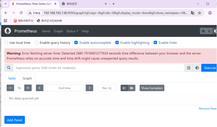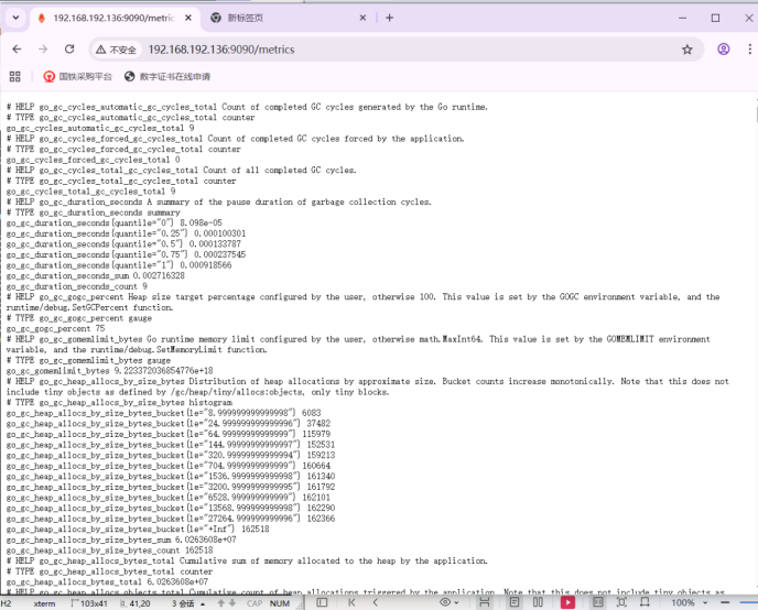 刷新服务配置并启动服务 [root@monitor ~]# systemctl daemon-reload [root@monitor ~]# systemctl start prometheus [root@monitor ~]# systemctl enable prometheus [root@monitor ~]# systemctl status prometheus 5.3.3通过浏览器输入http://192.168.192.136:9090,查看管理页面,通过http://192.168.192.136:9090/metrics 查看监控数据