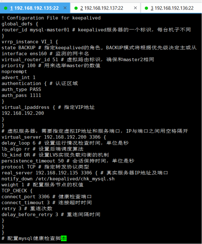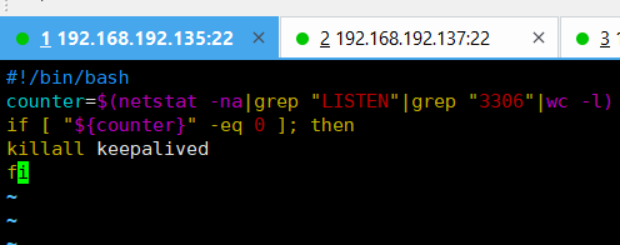 # 配置mysql健康检查脚本 [root@master1 ~]# vim /etc/keepalived/chk_mysql.sh