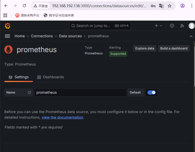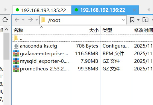 添加后重启 Prometheus: systemctl restart prometheus 在 Prometheus 界面验证数据访问 Prometheus 管理页面(http://192.168.192.136:9090),在查询框输入 mysql_up 并执行: 若能看到非空结果:说明 Prometheus 已成功抓取数据。 三、确认 Grafana 已正确关联 Prometheus 数据源 Grafana 需正确配置 Prometheus 数据源才能读取数据: 检查 Grafana 数据源配置登录 Grafana(http://192.168.192.136:3000,默认账号 admin/admin),按以下步骤验证: 进入 Configuration → Data Sources → Prometheus。 确认 URL 填写正确:http://192.168.192.136:9090(Prometheus 地址)。 点击 Save & Test,若提示 Data source is working:说明数据源连接正常。