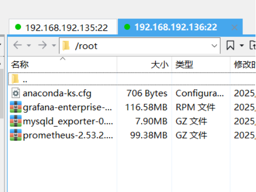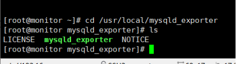 安装后进行解压 # 192.168.88.163 monitor主机操作 [root@monitor ~]# ls anaconda-ks.cfg mysqld_exporter-0.15.1.linux-amd64.tar.gz [root@monitor ~]# tar xvf mysqld_exporter-0.15.1.linux-amd64.tar.gz [root@monitor ~]# mv mysqld_exporter-0.15.1.linux-amd64 /usr/local/mysqld_exporter [root@monitor ~]# cd /usr/local/mysqld_exporter