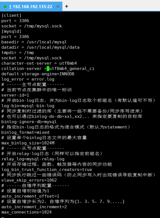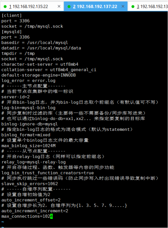 注意 server-id=1,为集群中本机标识,必须唯一 由于master1即使主节点又是从节点,则必须设置从节点配置 为了保证2个节点数据的一致性,需要开启自增序列配置,master1节点跳步为1 3 5 7 9... 创建用于数据同步的账号m1 [root@master1 ~]# systemctl start mysql [root@master1 ~]# mysql -uroot -p mysql> create user 'mback'@'%' identified with mysql_native_password by '123456'; Query OK, 0 rows affected (0.01 sec) mysql> grant replication slave on *.* to 'mback'@'%'; Query OK, 0 rows affected (0.00 sec) Master2 节点配置 Systemctl stop mysql Vim /etc/my.cnf