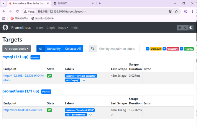 重启Prometheus,输入http://192.168.192.136:9090 测试是否监控MySql