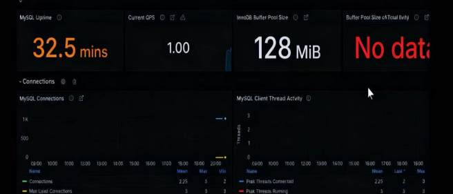 解决方案: Grafana 仪表盘显示 No data 的核心原因是数据链路未打通(从 MySQL → mysqld_exporter →Prometheus →Grafana 任一环节中断)。 按以下步骤排查并解决: 一、确认 mysqld_exporter 能正常采集 MySQL 数据 mysqld_exporter 是 MySQL 数据的源头,需先确保它能获取数据: 直接访问 exporter 接口 在服务器或本地执行命令,检查是否能获取到 MySQL 监控指标(如 mysql_up): curl http://192.168.192.136:9104/metrics | grep "mysql_up" 返回 mysql_up 1:说明 exporter 成功连接 MySQL 并采集数据(正常)。