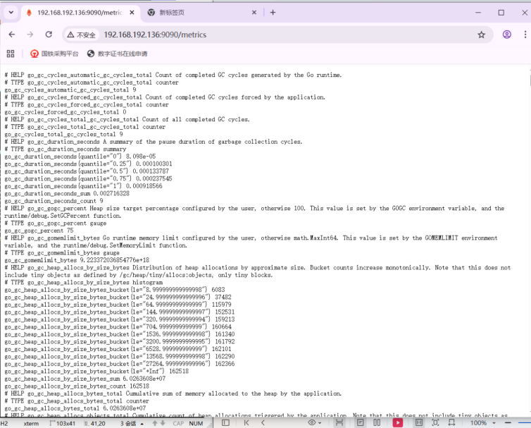 刷新服务配置并启动服务 # monitor节点操作 [root@monitor ~]# systemctl daemon-reload [root@monitor ~]# systemctl start mysqld_exporter.service [root@monitor ~]# systemctl enable mysqld_exporter.service [root@monitor ~]# systemctl status mysqld_exporter.service 通过浏览器输入http://192.168.192.136:9104/metrics,查看监控抓取msyql服务器的数据