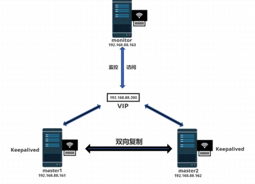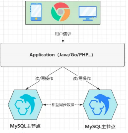 配置启动脚本后即可安装成功Mysql 4. 部署高可用MySql双主集群 搭建主-主集群,两个节点都是主库,也都属于对方的从库,也就是两者之间会相互同步数据,这时为了防 止主键出现冲突,一般都会通过设置数据库自增步长的方式来防重 主-主架构集群适用于中读写请求的比例对半开,同时整体的并发量也不算低,至少超出了单库的承载阈值 的场景下,架构图如下: