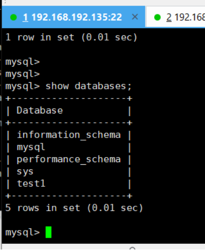 同理,master2节点上建立复制关系: [root@master1 ~]# mysql -uroot -p mysql> change master to master_host='192.168.192.135',master_user='mback',master_password='123456',master_po rt=3306,master_log_file='mysql-bin-log.000001',master_log_pos=672; Query OK, 0 rows affected, 9 warnings (0.01 sec) mysql> start slave; Query OK, 0 rows affected, 1 warning (0.01 sec) mysql> show slave status\G 4.3 局部测试 4.3.1 Master 1上建立数据库 mysql> create database test1; Query OK, 1 row affected (0.01 sec)