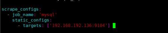 5.3.4Mysqld_exporter对接Prometheus # monitor操作,打开文件,添加如下内容,注意对齐格式,# 注意:是监控机IP和Mysqld_exporter端口 [root@monitor ~]# vim /usr/local/prometheus/prometheus.yml - job_name: "mysql" static_configs: - targets: ["192.168.88.163:9104"] labels: instance: mysqld_exporter 重启Prometheus,输入http://192.168.192.136:9090 测试是否监控MySql