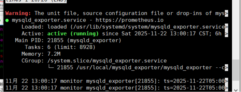 刷新并重启服务 执行以下命令刷新系统服务配置并重启mysqld_exporter systemctl daemon-reload systemctl restart mysqld_exporter.service systemctl status mysqld_exporter.service # 查看服务状态,确认是否启动成功