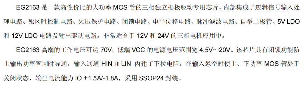 EG2163 是一款高度集成的三相独立半桥驱动芯片 ,内置双路LDO和自举二极管 ,提供1.5A/1.8A强大驱动能力 ,专为12V/24V三相无刷电机驱动系统 提供完整的功率驱动和电源管理解决方案。