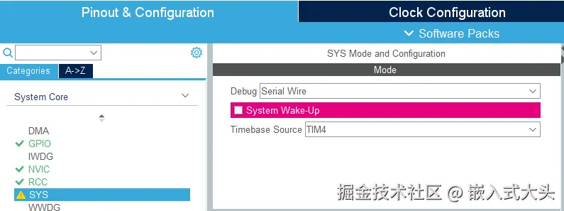 SYS的Debug为Serial Wire,Timebase Source为TIM4前者是为了能把代码下载进单片机,后者是因为HAL本身和FreeRTOS都默认依赖SysTick,可能出现卡死的问题,所以为了保险起见,可以考虑在SYS选择HAL时钟源的时候换成其他的,比如TIM4