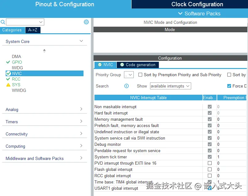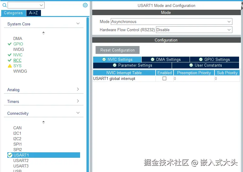 Time base: TIM4 global interrupt和System tick timer的优先级都为1 - 打开USART1的中断,优先级设置为0
