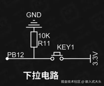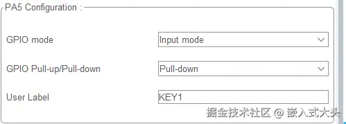 因为我的按键另一端连接的是正极,所以我的PA5设置为了下拉输入,让PA5默认为低电平,当按键按下时,PA5会表现为高电平: