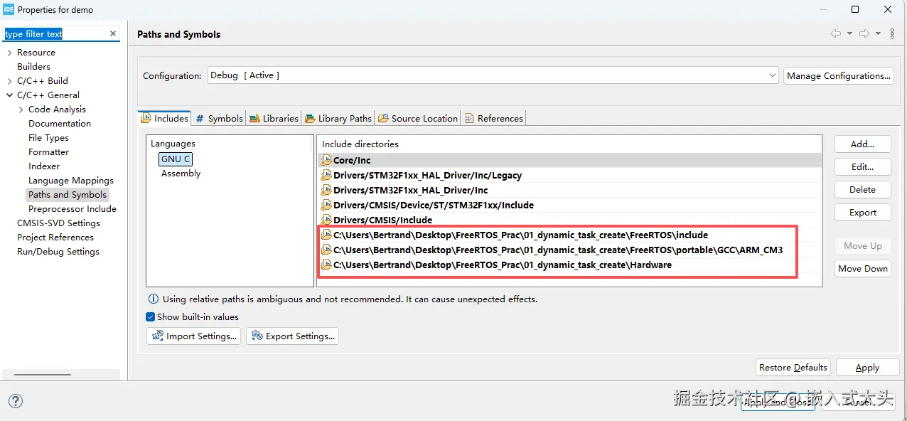 - 把Hardware文件夹和FreeRTOS文件夹加入项目编译范围 右键项目名字,点击Properties,进入如下页面: