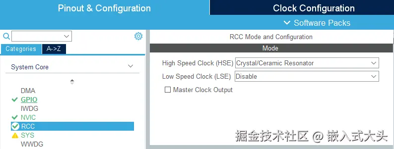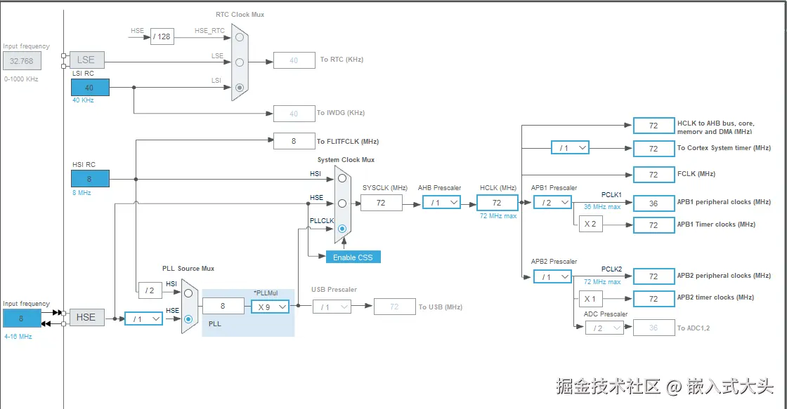 RCC的时钟来源设置为HSE,调整系统时钟为72MHZ: