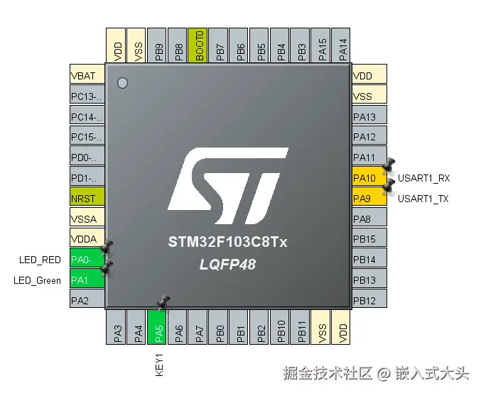 PA0为红色LED,PA1为绿色LED,PA5为按键1,PA9和PA10用作串口发送