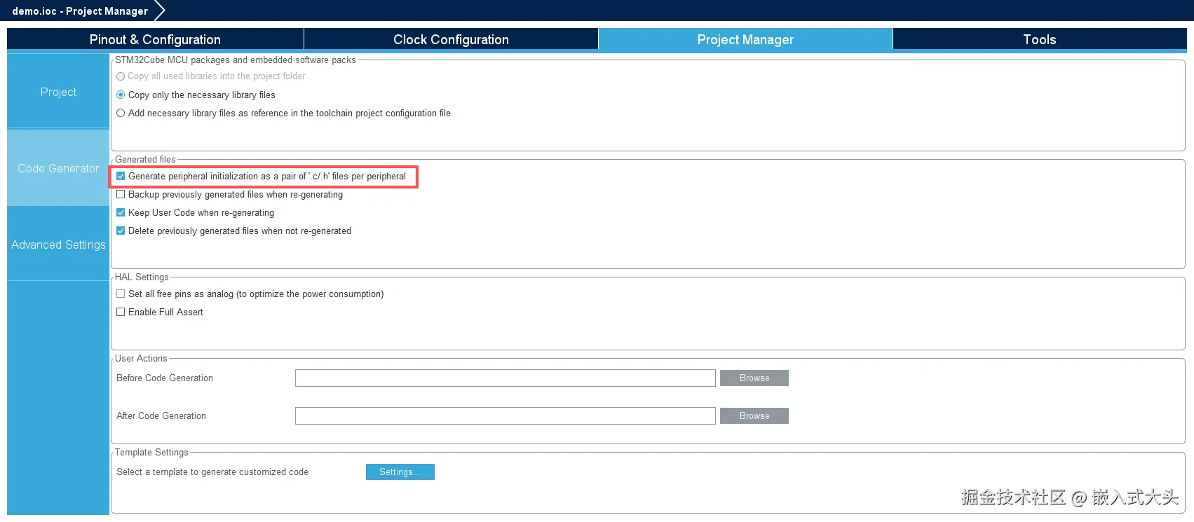 Project Manager中的Code Generator,勾选每个外设生成一对".c/.h文件"初始化