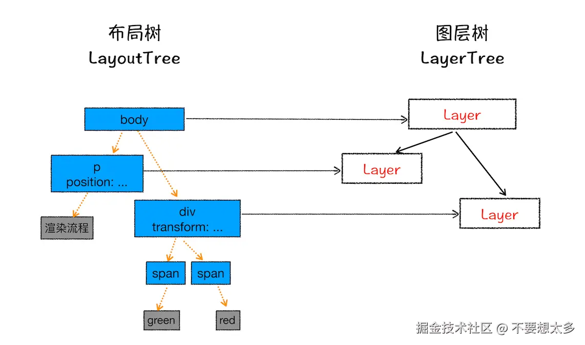 渲染引擎需要为节点生成专用的图层,并生成一棵对应的图层树(LayerTree),具有几个特点
