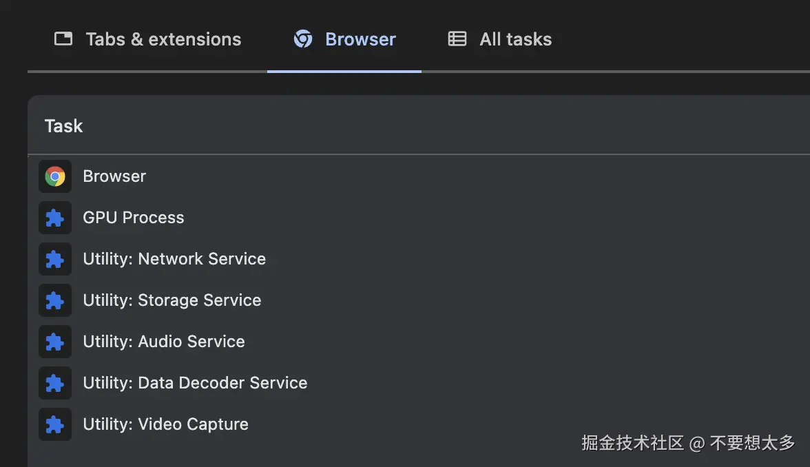 - GPU 进程:只有一个 GPU 进程,为所有浏览器 Tab 标签页服务。它负责与 GPU 硬件直接通信,执行页面光栅化和合成操作