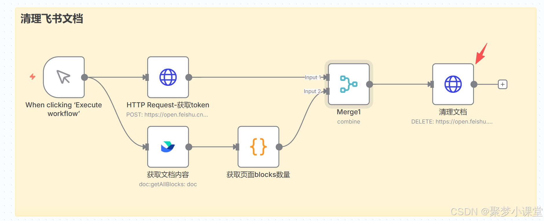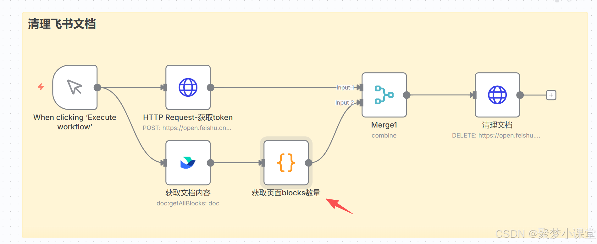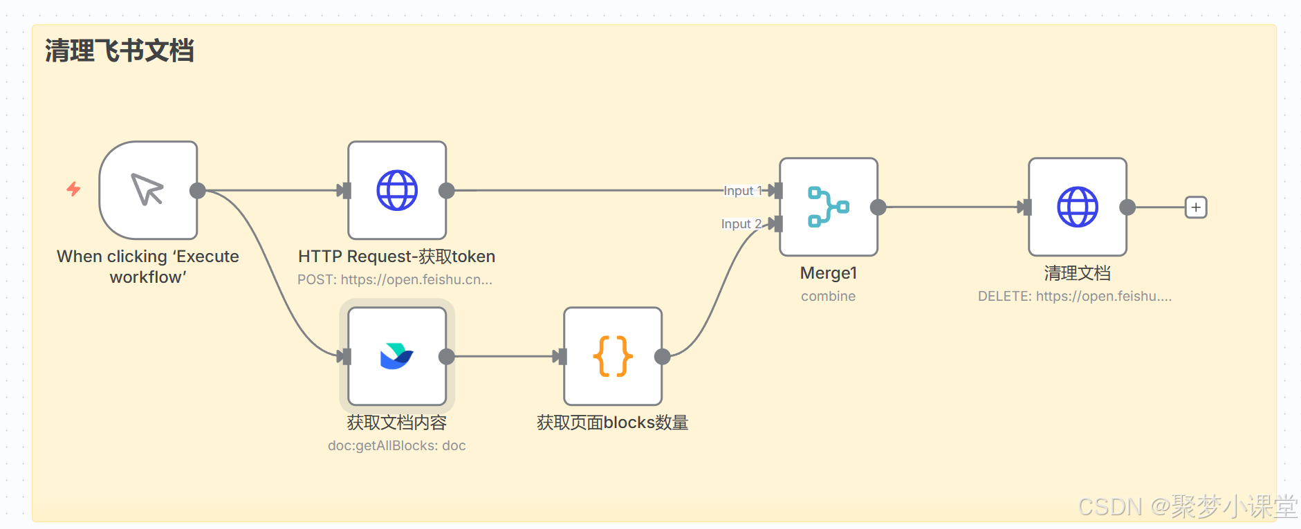 第四步,按照这样的方式先把框架搭建起来(地球图标的是http request节点,大括号图表的是code节点,飞书的就是飞书节点咯):