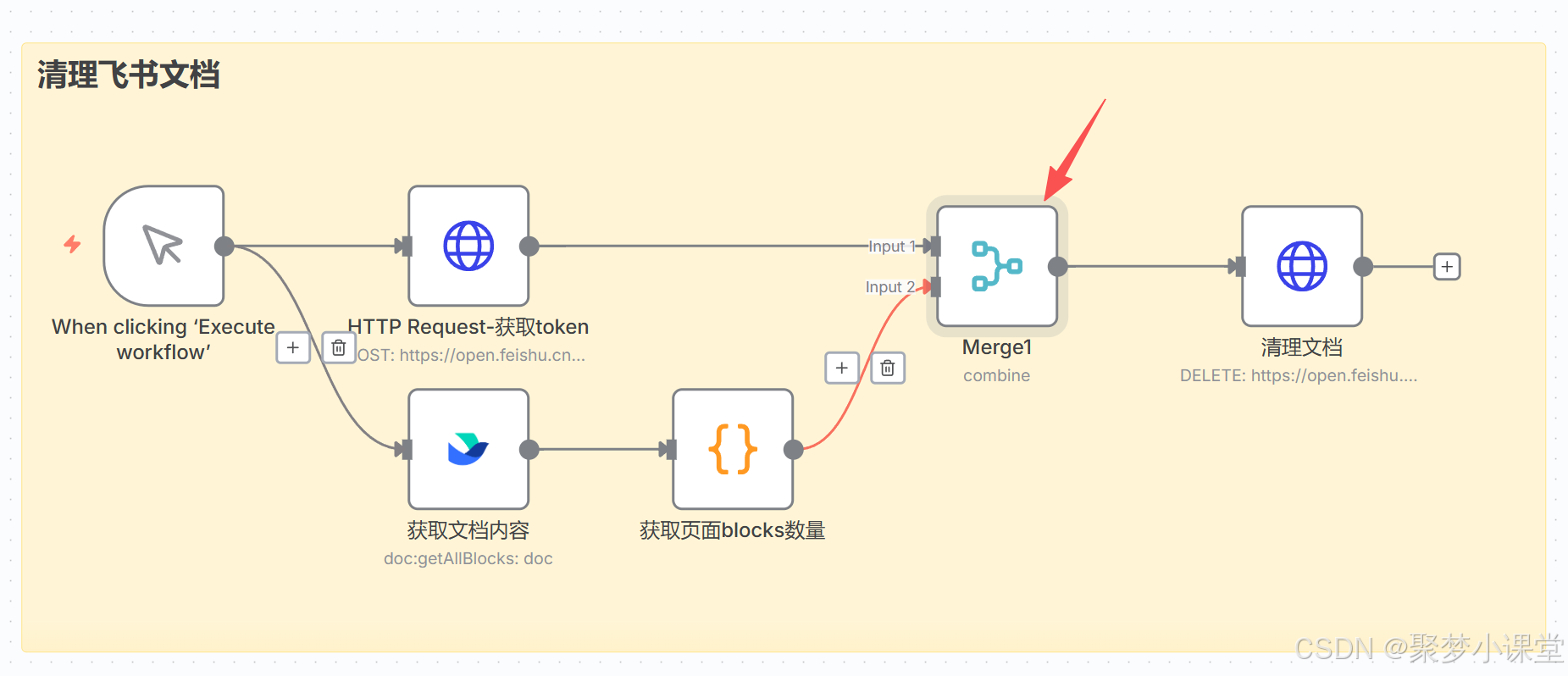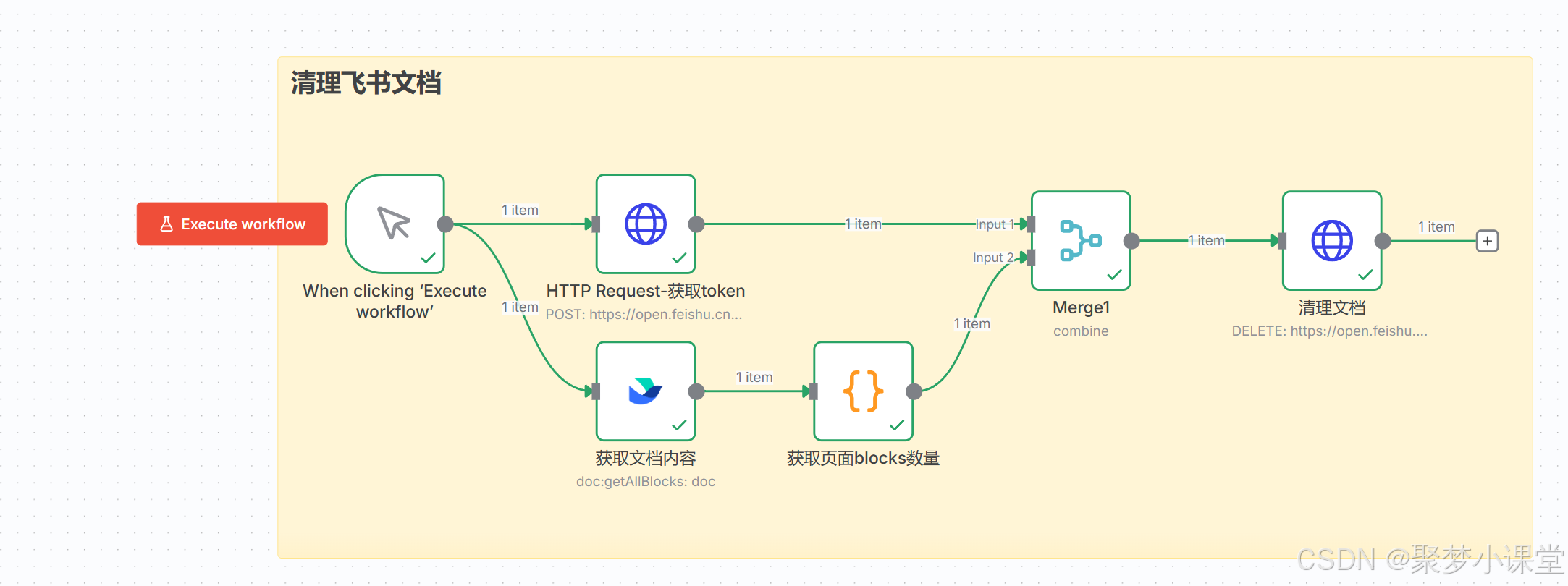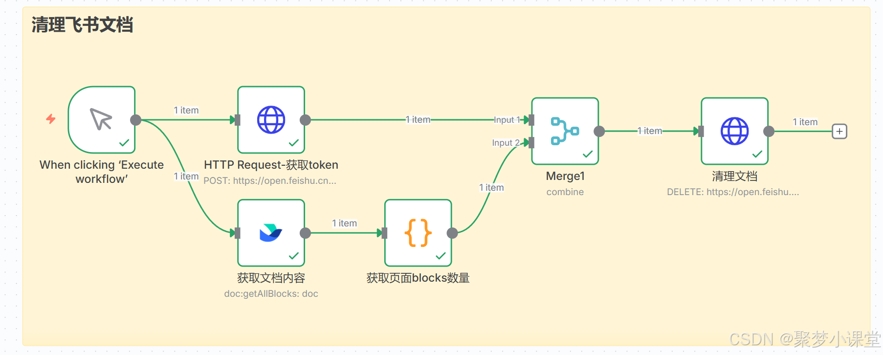 第四步,按照这样的方式先把框架搭建起来(地球图标的是http request节点,大括号图表的是code节点,飞书的就是飞书节点咯):