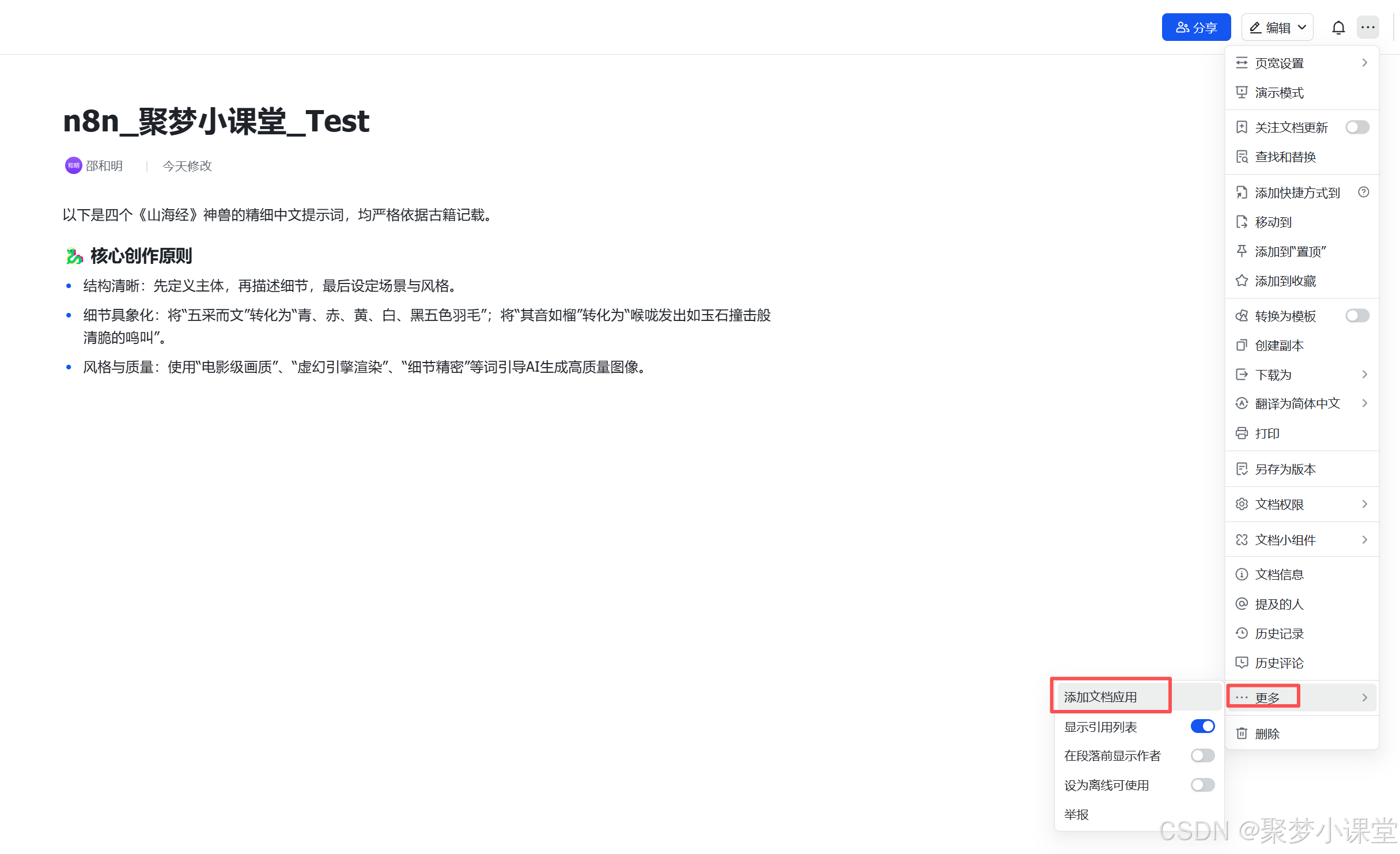 然后在要操作的飞书文档页面添加你申请好的飞书应用:
