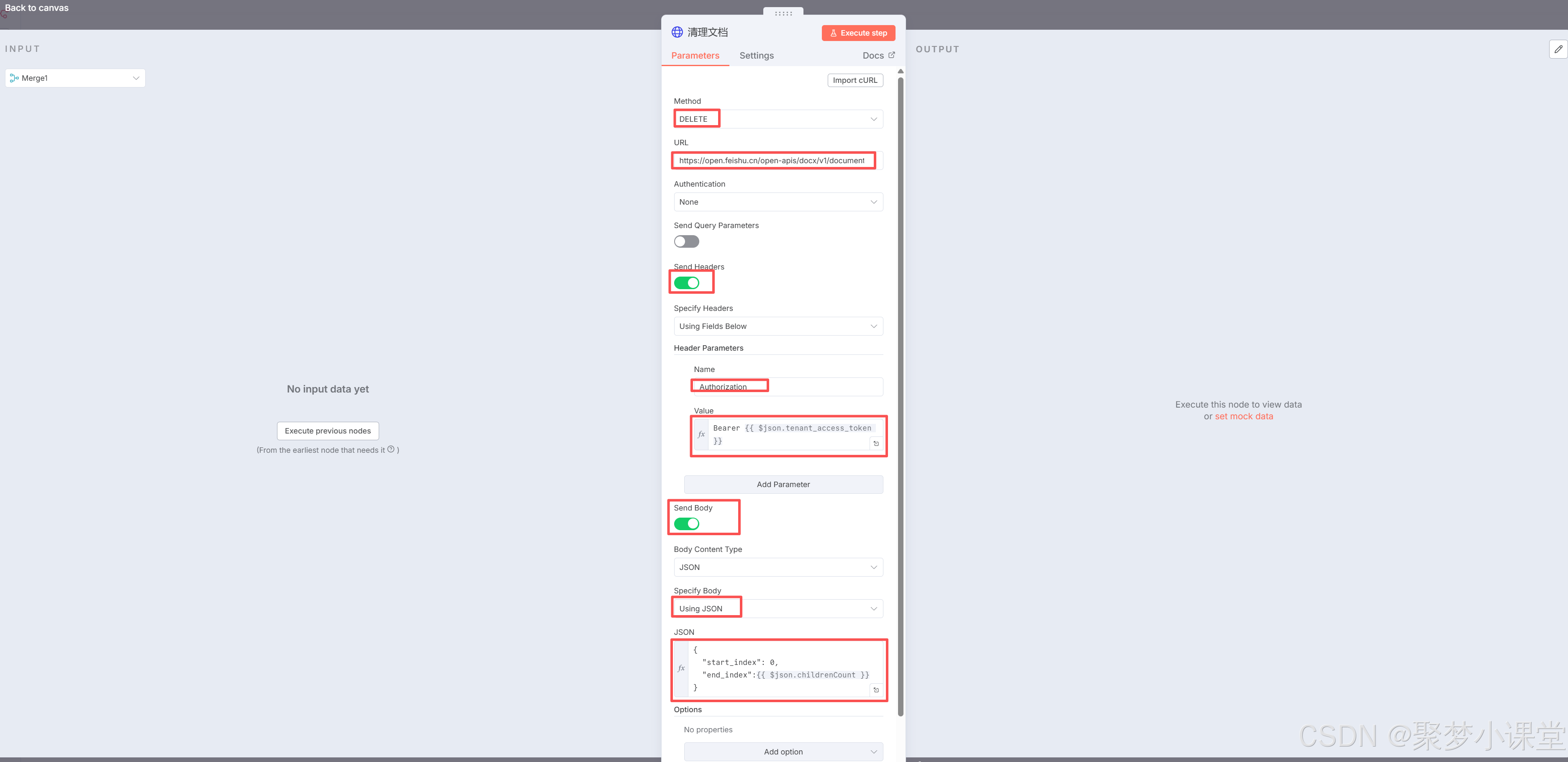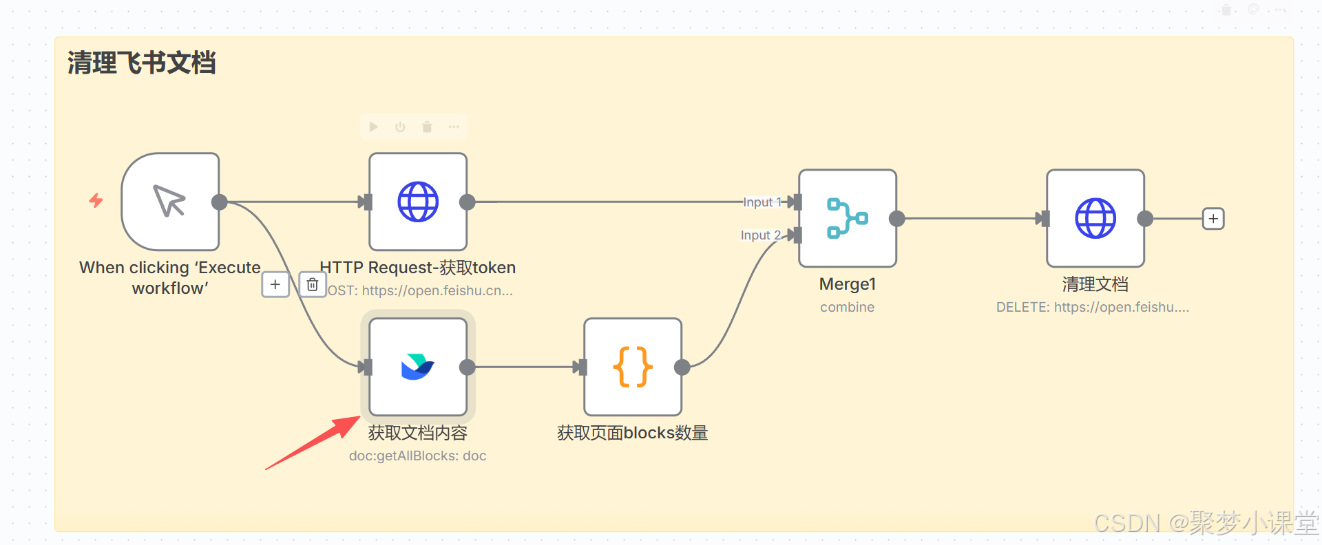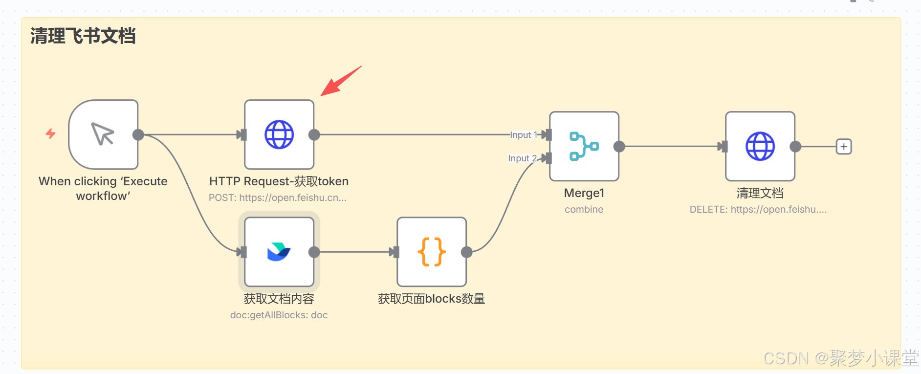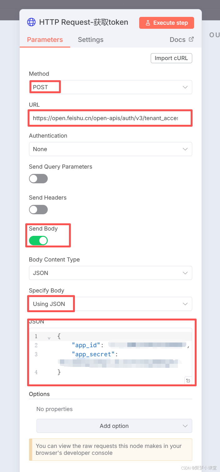 第五步,先配置获取token节点,因为飞书文档的token每隔一段时间就会变更,所以你需要配置一个httprequest节点来动态的获取;