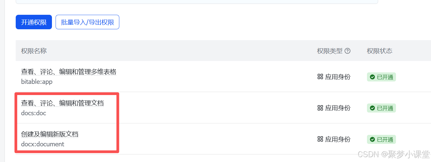 首先,你需要有一个做好的飞书应用,并且设置好飞书文档的读写权限,这一步比较简单,直接略过。保证这两个权限都开了就好(其实开docx应该就可以):