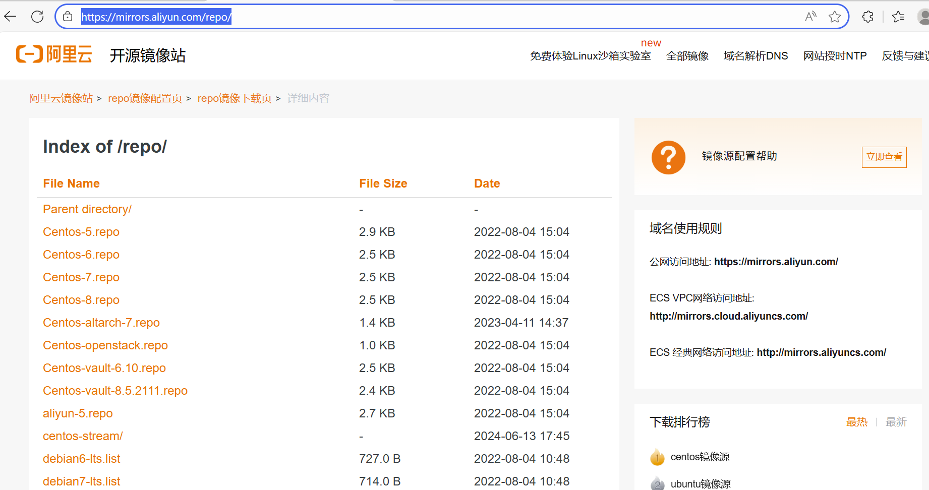 在https://developer.aliyun.com/mirror/centos页面,给出了替换/etc/yum.repos.d中系统自带repo文件的阿里镜像源文件连接: