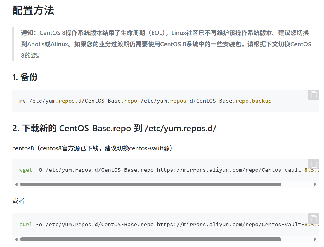 之前我们基本都使用的是centos 8 stream,不过centos 8 的EOL已经过期,Linux社区不再维护,所以我们之前更改镜像源时使用的那些都已经失效了...... 虽然我也尝试了新版本的系统,但我实在受不了那个章鱼桌面。所以,还是找找过期的镜像源吧,还好阿里开发者社区的存货还比较全面。