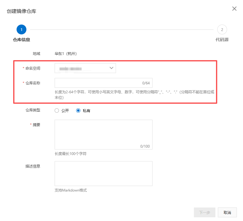 这里填入的命名空间和仓库名称会形成访问镜像的url路径
